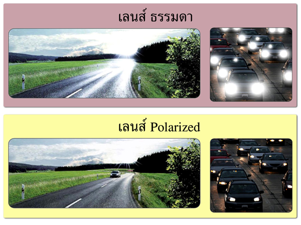 * เลนส์ Polarized มีการเคลือบด้วยโพลาไลซ์อีกชั้น จะมีคุณสมบัติพิเศษช่วยตัดแสงสะท้อนจากพื่นผิวน้ำ ผิวถนน ได้เป็นอย่างดีดี